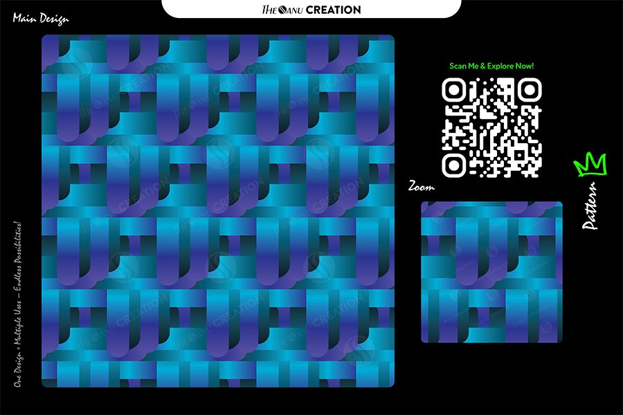 This seamless abstract design showcases layered interlocking forms in vibrant aqua and deep indigo tones, forming a structured grid with smooth geometric continuity. The color transitions create depth and dimensional contrast, while the repeating loop-based construction introduces a sense of connection, flow, and modern precision.