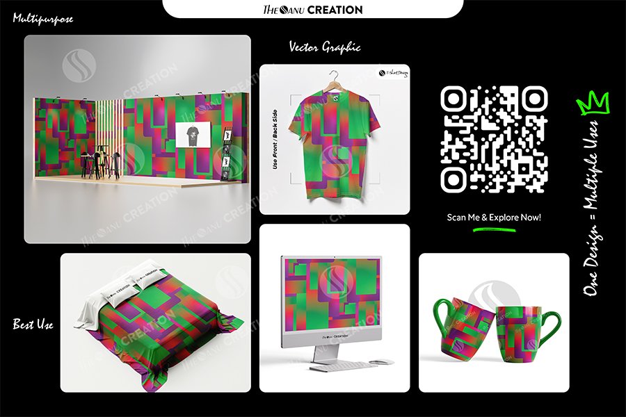 Introducing Chromatic Fusion Gradient Pattern by THE SANU CREATION — a vibrant abstract vector artwork designed with multi-layered geometric blocks, smooth chromatic transitions, and a powerful blend of green, red, orange, and purple hues. The expressive colour fusion and structured layering create a modern, energetic visual aesthetic suitable for a wide range of professional creative projects.