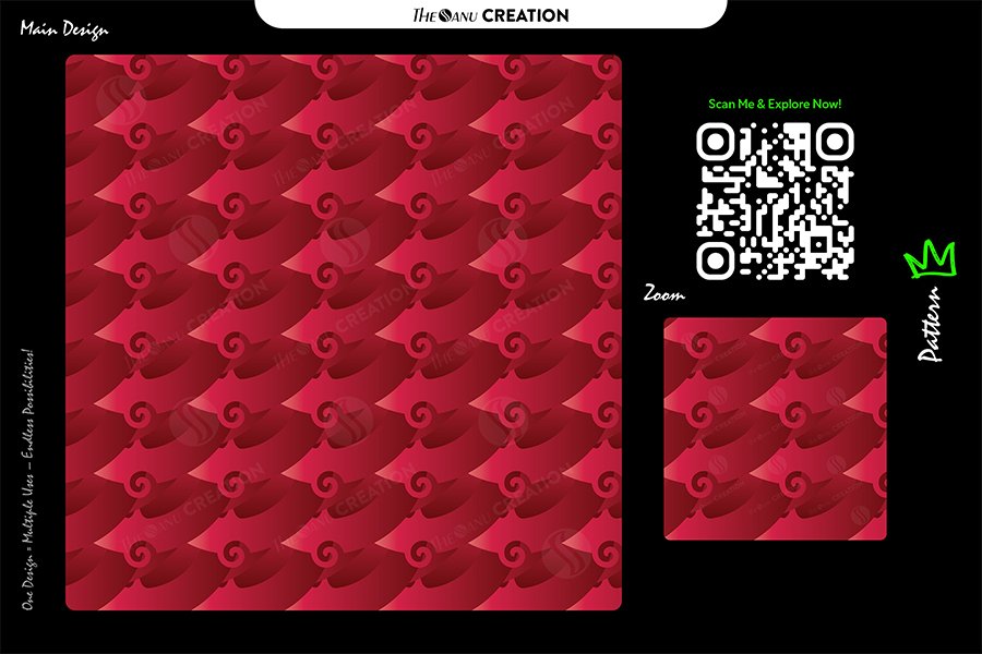 This premium seamless abstract design presents flowing crest-inspired shapes layered in rich crimson and deep red gradients, accented with subtle spiral details that enhance rhythm and visual motion. The repeating structure creates a sense of continuity and controlled energy, resulting in an aesthetic that feels bold, expressive, and professionally refined.