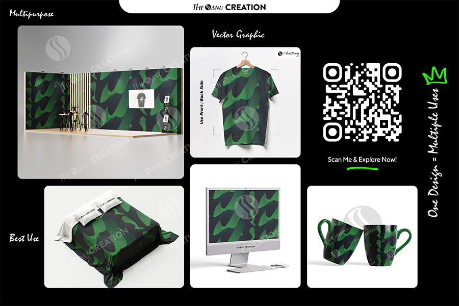 Introducing Emerald Flow Pattern Design by THE SANU CREATION — a premium abstract surface system defined by elongated layered forms, smooth gradient transitions, and directional visual movement. The deep emerald tones combined with dark overlays create a rich, immersive composition that delivers both strength and elegance.