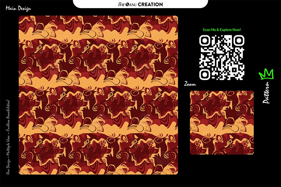Introducing Fiery Swirl Abstract Pattern by THE SANU CREATION — a bold, luxurious abstract artwork featuring dynamic red and gold swirling forms. The rich color harmony and fluid energy make this pattern ideal for high-end textile designs, premium wallpapers, luxury packaging, and versatile digital applications.