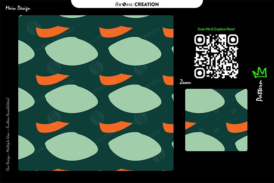 A composed arrangement of rounded sage-green oval forms positioned across a deep forest base, accented with bold citrus-orange curved elements arranged within a disciplined seamless repeat structure. The balanced spacing between the soft organic shapes and the sharper accent curves creates visual rhythm while preserving alignment precision across the surface.