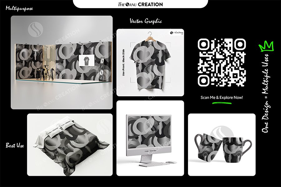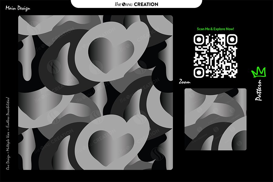 Introducing Heartwave Monochrome Gradient Pattern by THE SANU CREATION — an elegant abstract vector artwork created with layered heart contours, smooth grayscale gradients, and flowing organic curves. The soft black-to-silver transition adds depth and a refined modern aesthetic, giving the design strong visual versatility across multiple creative formats.