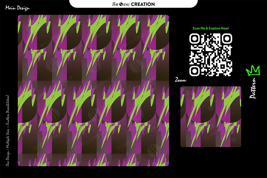 Introducing Neon Strike Fusion Pattern by THE SANU CREATION — a high-impact visual design built around electrifying lime streaks layered over deep purple and warm brown structural forms. The contrast between neon energy and solid geometric rhythm produces a bold, expressive pattern that instantly elevates any creative layout.