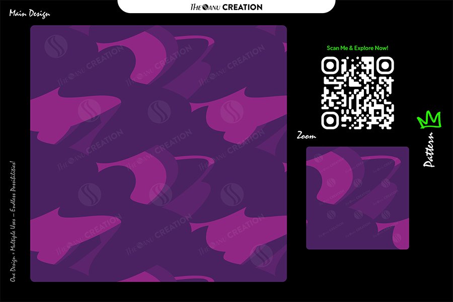 A composed arrangement of sweeping abstract forms layered in orchid and magenta tonal variations over a deep purple foundation. The structured repeat establishes fluid movement while preserving visual balance and seamless continuity, forming a contemporary abstract surface suited for expressive yet system-driven brand environments.