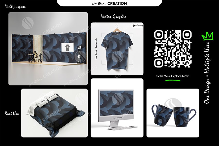 Introducing Steel Blue Curve Pattern Design by THE SANU CREATION — a premium abstract surface system defined by bold curved forms, steel blue gradients, and controlled shadow depth. The flowing structure creates a strong visual rhythm while maintaining a clean and modern aesthetic.