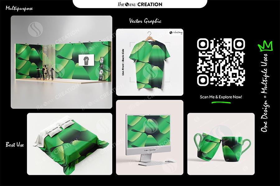 This pattern blends rich green gradients with darker shadowed transitions, forming soft flowing shapes that move naturally across the surface. The subtle contrast between light and dark green tones creates a premium visual rhythm that feels modern, balanced, and immersive. Designed as a seamless vector, it integrates effortlessly into digital and print applications, making it ideal for branding systems, packaging designs, editorial layouts, UI backgrounds, posters, wallpapers, apparel surfaces, and contemporary merchandise. Its calming yet confident aesthetic allows it to support both bold visual identities and minimal design systems with equal effectiveness.